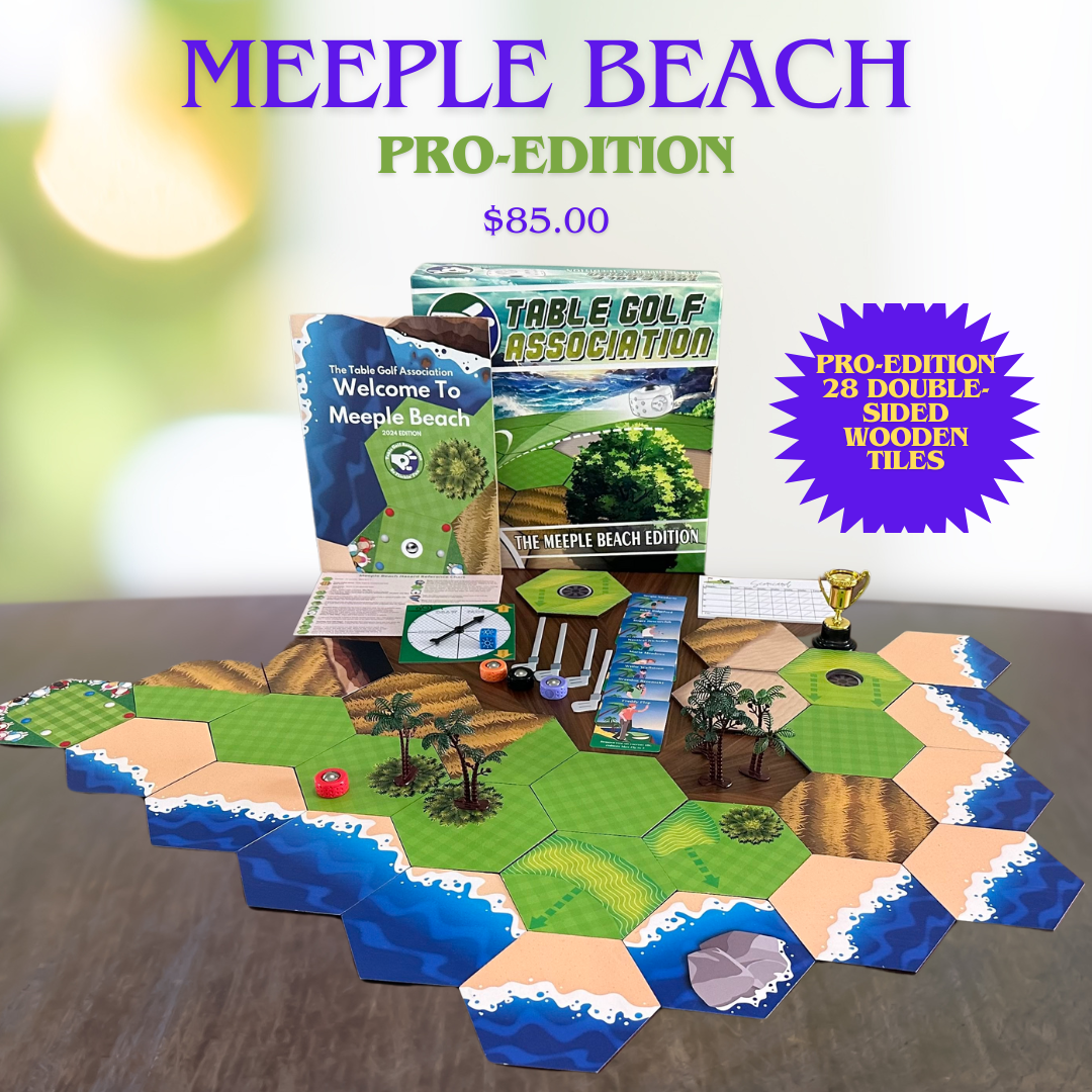 Welcome to America’s favorite oceanside golf course…Meeple Beach! This is the Pro Edition that comes with 28 double-sided heavy-duty wooden tiles. Now you can design and play the oceanside course of your dreams!